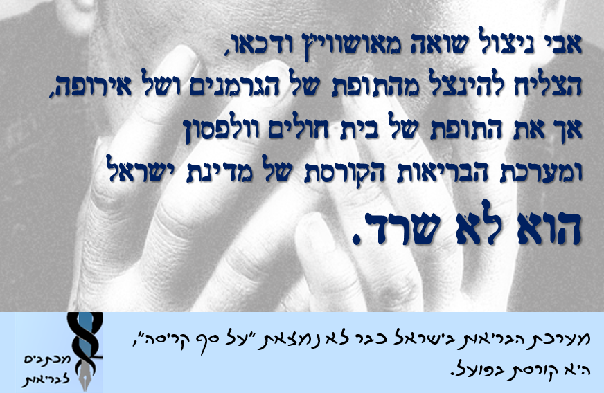 מערכת הבריאות, אשר בראשה עומדת חברת מפלגתך יעל גרמן, איבדה כל צלם אנושי והשירותים אותם אזרחי ישראל מקבלים מדי יום אינם תואמים את התקופה בה אנו חיים, במאה ה-21. אני כאזרח שומר חוק ומשלם את מס הבריאות מדי חודש, נתקל במערכת רקובה, מסורבלת וחסרת המשאבים הנדרשים כדי לתת מענה אנושי בסיסי למבוטחיה.