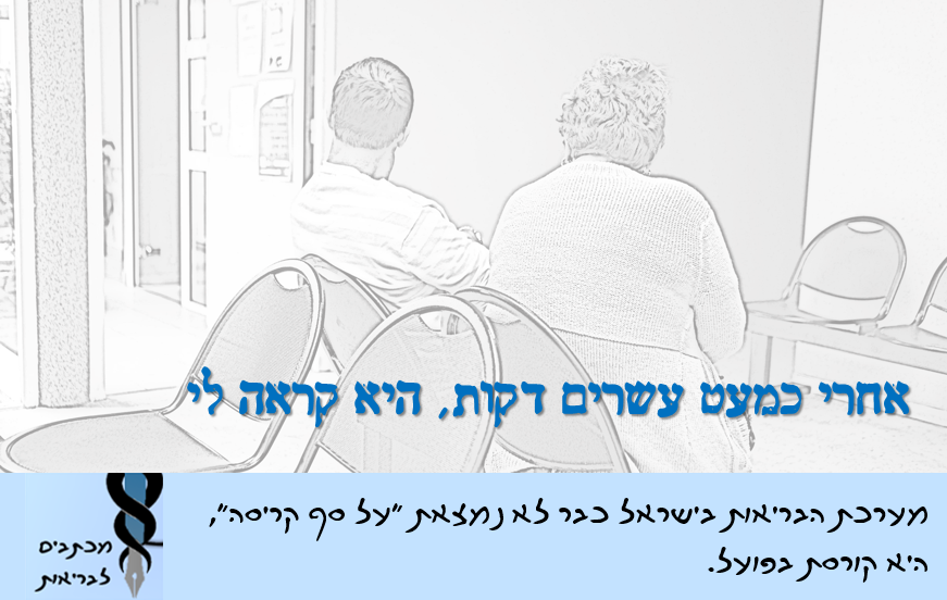 אני הייתי הבא בתור, הדלת נפתחת ויוצא חולה ואני ממתין שיקראו לי להיכנס – עוברת דקה שתיים, אני רואה את הרופאה מקלידה במחשב ואז מטלפנת בנייד שלה אל מישהו. עוברות עוד חמש דקות, והיא ממשיכה לדבר עם אותו מישהו, נראה שהיא אפילו קצת עצבנית. עוד חמש דקות עוברות ואני יושב מולה – אבל מחוץ לחדר, מראה בכוונה סימנים של חוסר שביעות רצון מכך שעוד מעט חולפות להן חמש עשרה דקות והיא בטלפון.