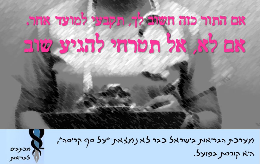 כך מדבר רופא במרפאה לצעירים לוקים בנפשם. ניגשתי למזכירה, ואותה גישה 'היית צריכה למצוא דרך להקדים. אפילו אם לא מצאת את המקום, אין שום סיבה שתבואי ותתלונני.'