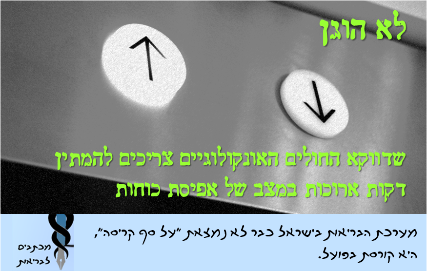 וזה כל כך לא הוגן. זה לא הוגן שדווקא החולים האונקולוגיים, שקשה להם לעמוד וקשה להם ללכת, צריכים להמתין דקות ארוכות במצב של אפיסת כוחות, או להשתמש במדרגות כשהמעלית נתקעת או לא מתפקדת."
