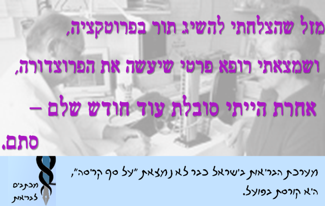 "אני בת 27. היתה לי אפנדיציט שהתפוצץ בבטן. רופאת המשפחה שהלכתי אליה פעמיים לא זיהתה את זה למרות שהגעתי אליה עם כאבים, נתנה לי רק 'קלבטן'. התלוננתי אחר כך להנהלה של 'כללית'.