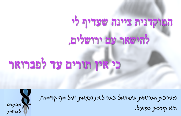 התקשרתי היום (10.12.14) למוקד של קופת חולים כדי לתאם בדיקה (לא דחופה) שהופניתי אליה. מכיוון שהחיים מביאים לכך שאני נעה כל הזמן על ציר תל אביב-ירושלים, ניסיתי לתאם באחת משתי הערים הללו בדיקה, מתוך מחשבה שהמבחר יאפשר לי להתאים את הבדיקה ללו"ז שלי ולא להיפך.