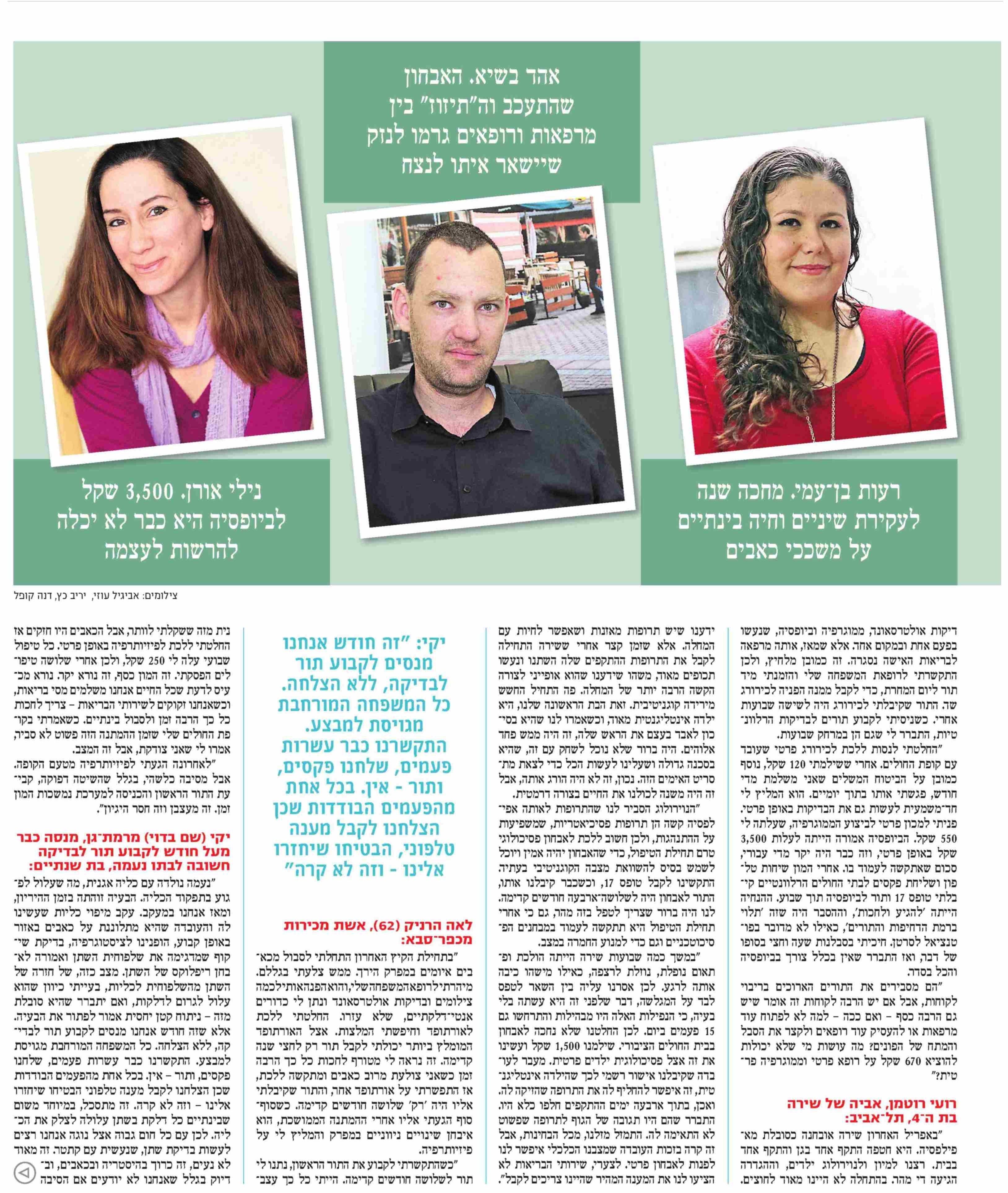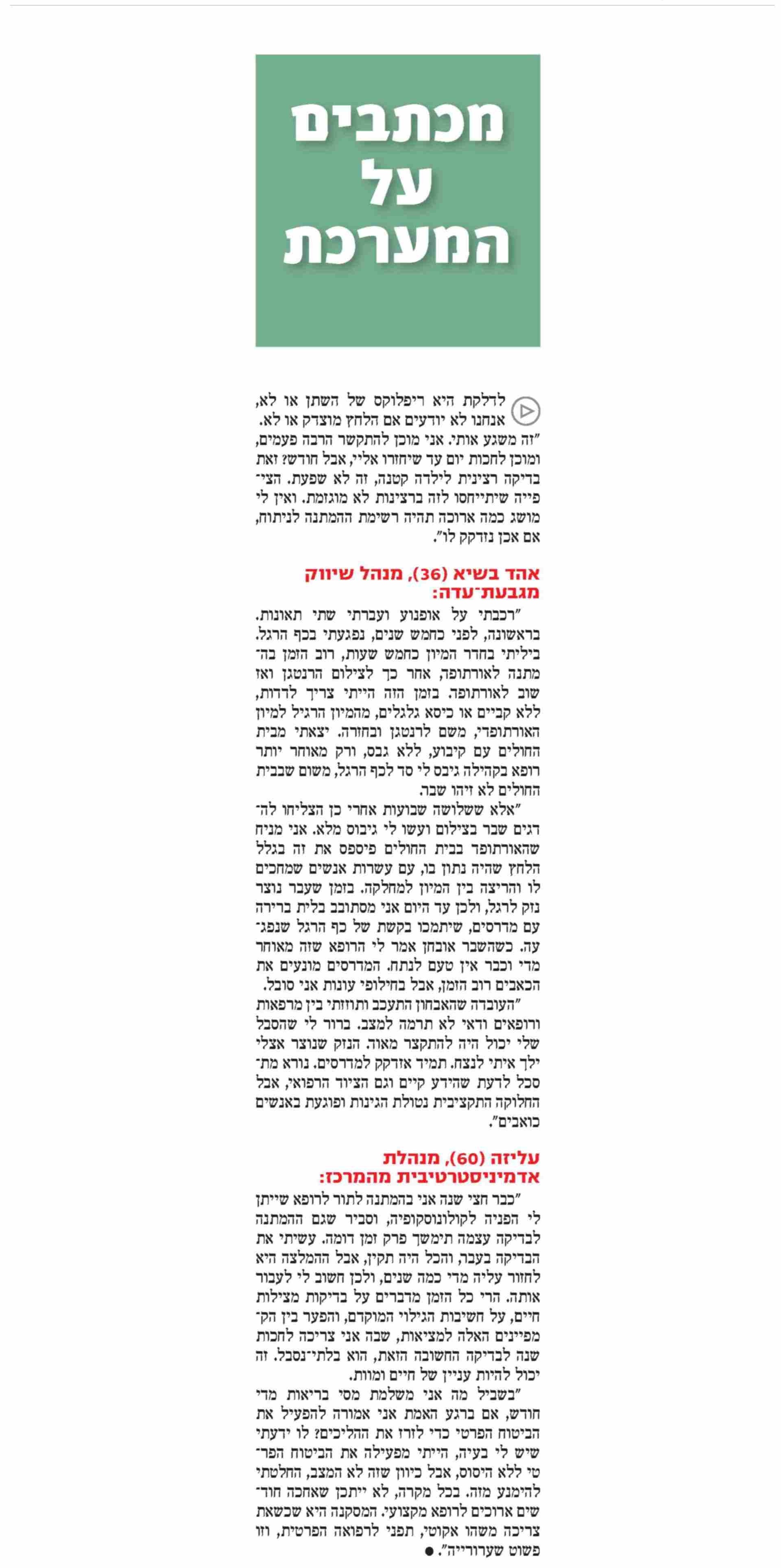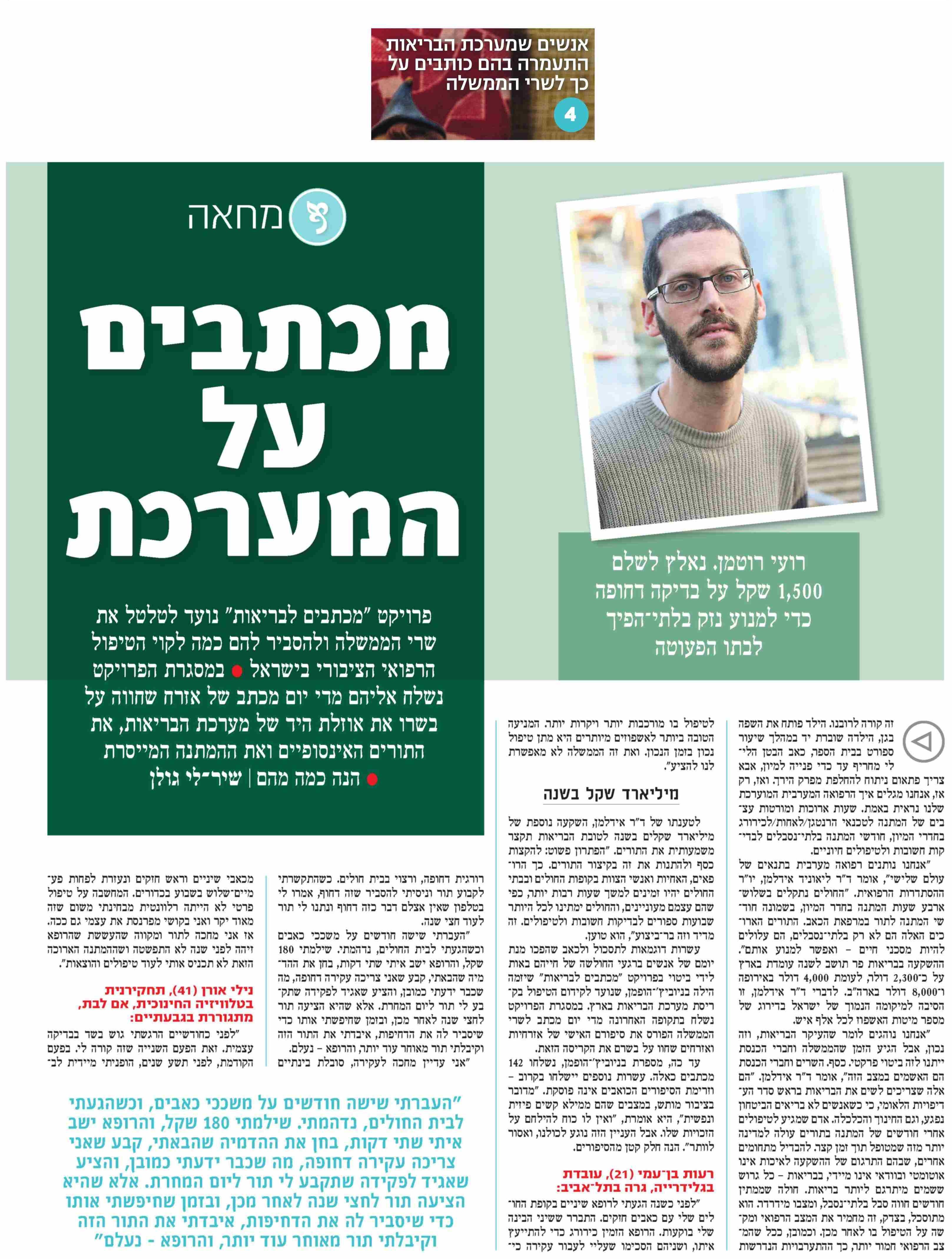 אתמול התפרסמה ב'ידיעות אחרונות' כתבה בנושא פרויקט מכתבים לבריאות, שהתייחסה ספציפית לבעיית התורים הארוכים במערכת הבריאות הציבורית. תודה למרואיינות ולמרואיינים, וליו"ר הסתדרות הרפואית ד"ר ליאוניד אידלמן, על העלאת המודעות לנושא והקריאה הנחרצת לפעולה מצד הממשלה.